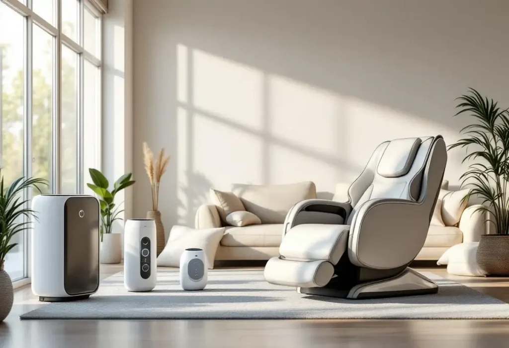 Présentation synthétique de l’offre et des axes d’innovation. La gamme couvre trois pôles principaux : fauteuils massants intelligents, purificateurs d’air et appareils de récupération. Chaque sous‑section détaille fonctionnalités, bénéfices et limites pratiques.